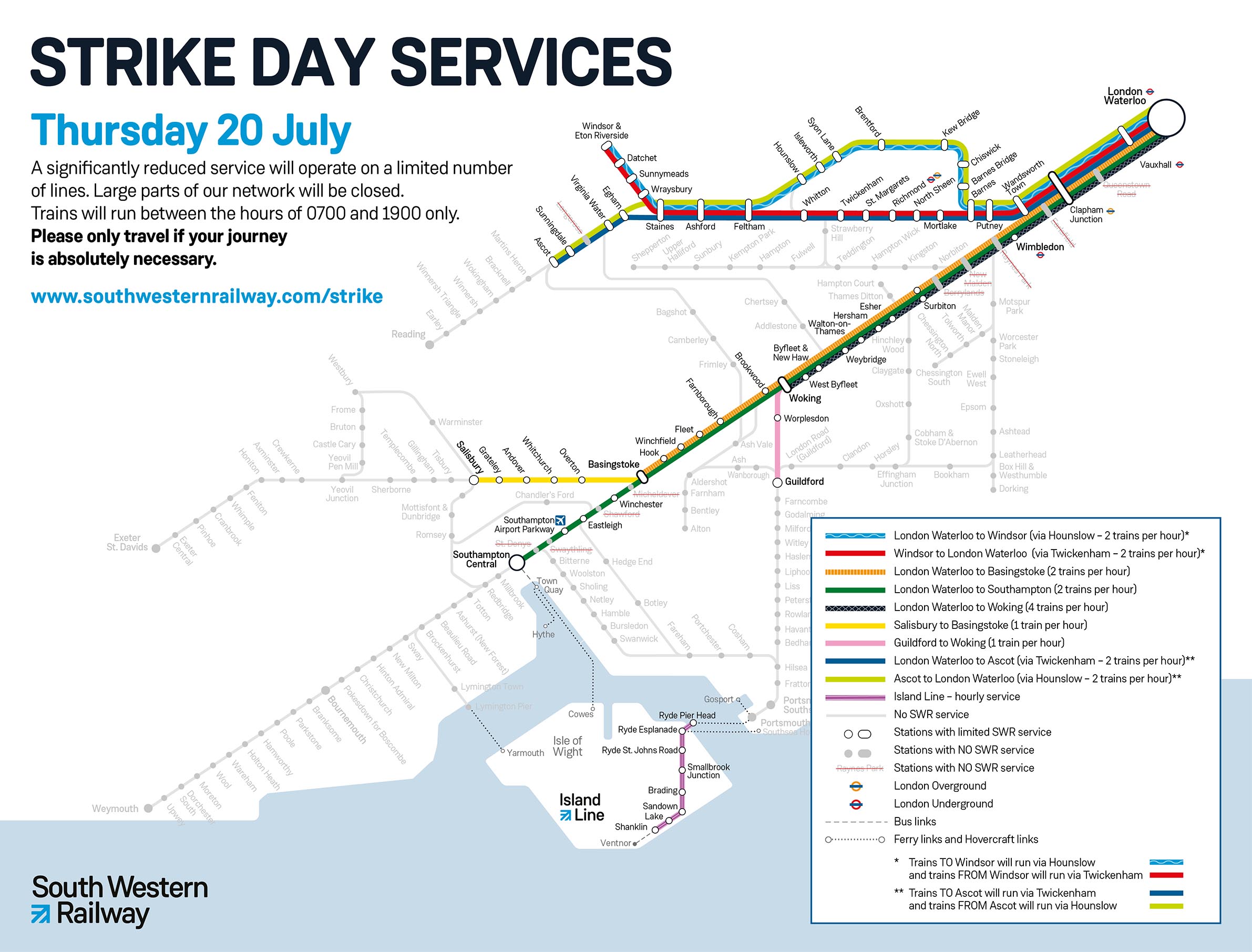 On Thursday 20 July, nationwide strike action by members of the RMT union will mean a significantly reduced service will operate on a limited number of lines. Trains will only operate between the hours of 0700 and 1900, with last trains departing at around 1700. Customers are advised to only travel if absolutely necessary.