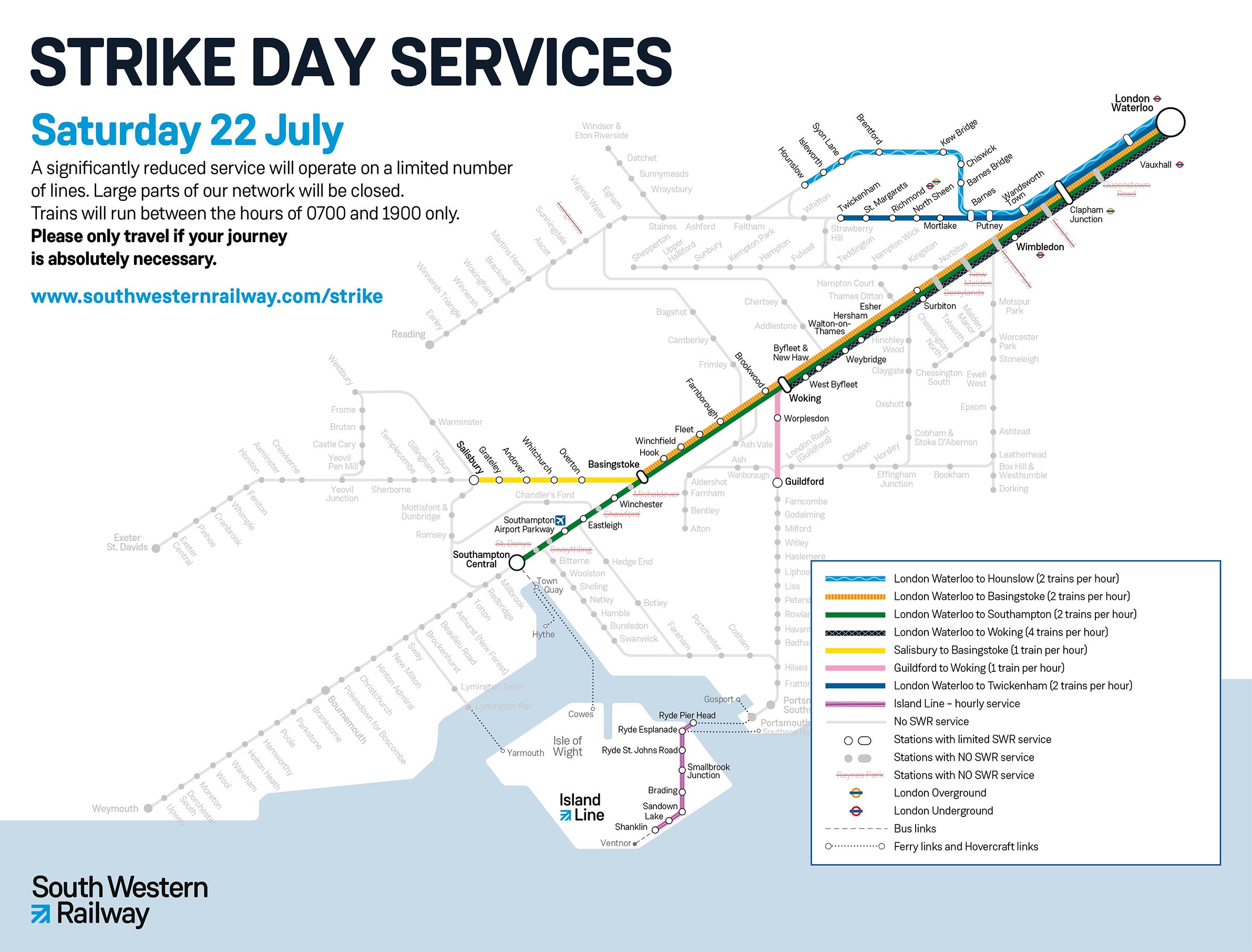 On Saturday 22 July, nationwide strike action by members of the RMT union will again mean a significantly reduced service on a limited number of lines. Trains will only operate between the hours of 0700 and 1900, with last trains departing at around 1700. Customers are advised to only travel if absolutely necessary.