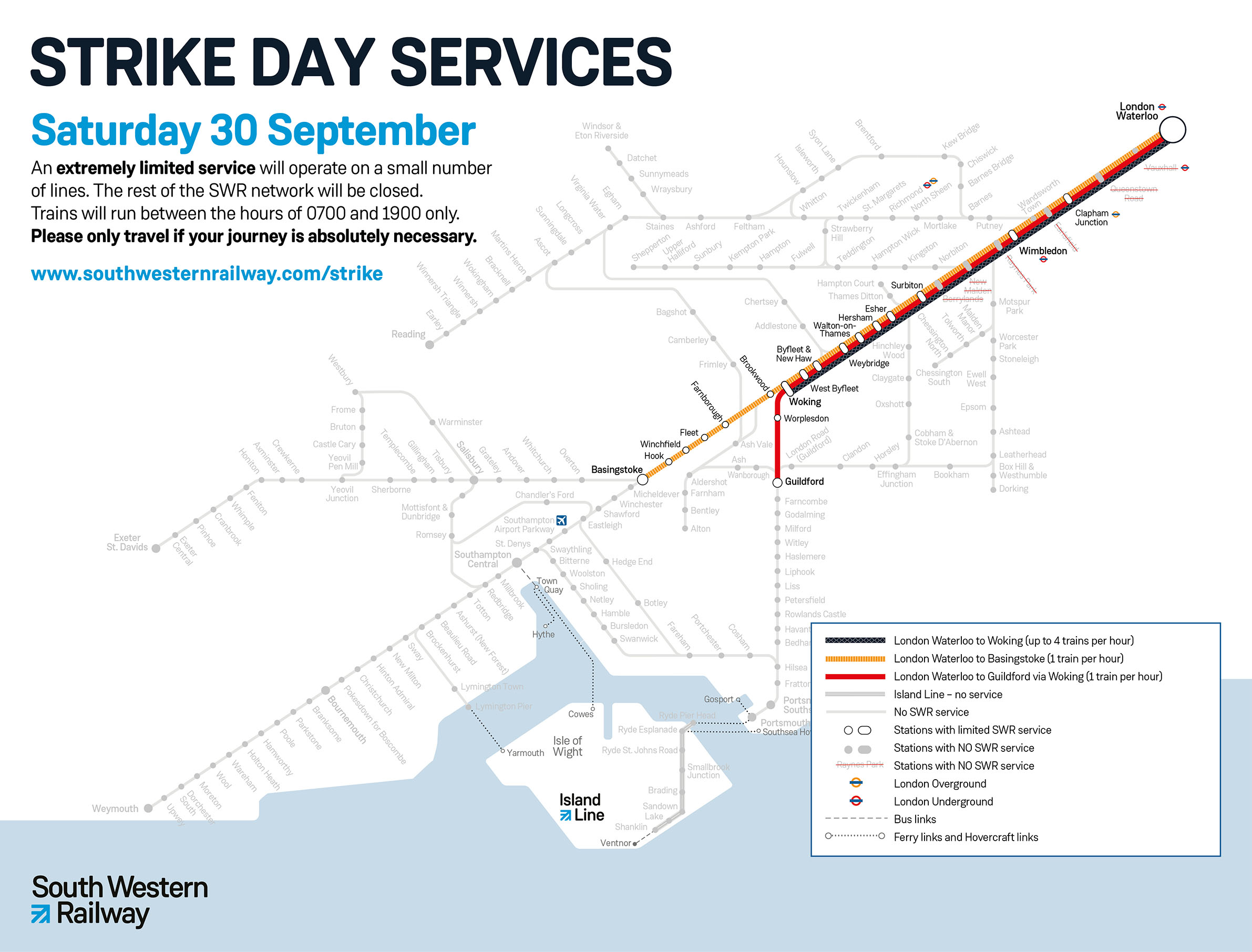 On Saturday 30 September trains will only run between London Waterloo and Basingstoke, Woking and Guildford via Woking. On Wednesday 4 October trains will only run between London Waterloo and Basingstoke, Feltham, Woking, Guildford via Woking and between Basingstoke and Salisbury.